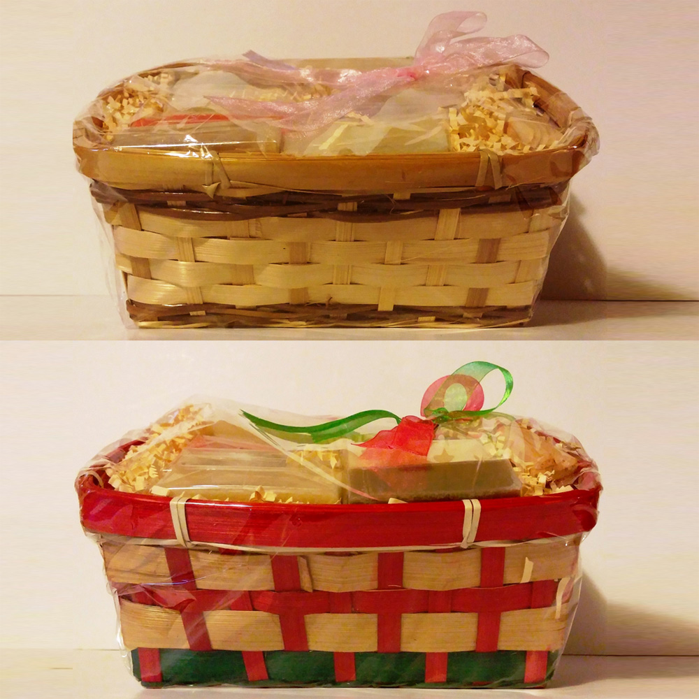 This gift will make someone very happy. Contains 11 bars of soap (your choice) plus our spa-style draining soap dish, in a reusable rectangular basket (natural colors or red and green), wrapped in cellophane with your choice of our ribbon color combinations.