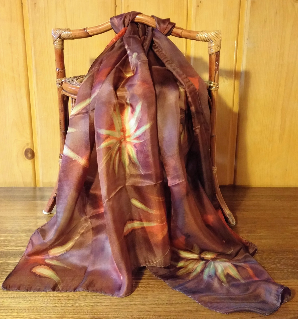 Beautiful handmade silk scarf from the Galil region of Israel. Scarves do not require dry cleaning, but may be hand washed in cold water with mild soap such as Delicare, air dried, and ironed with a cool iron to retain their beauty. 150 cm x 45 cm. No sales tax in MN.