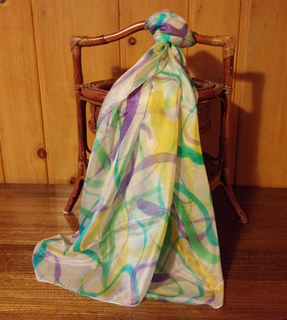 Beautiful handmade silk scarf from the Galil region of Israel. Scarves do not require dry cleaning, but may be hand washed in cold water with mild soap such as Delicare, air dried, and ironed with a cool iron to retain their beauty. 150 cm x 45 cm. No sales tax in MN.